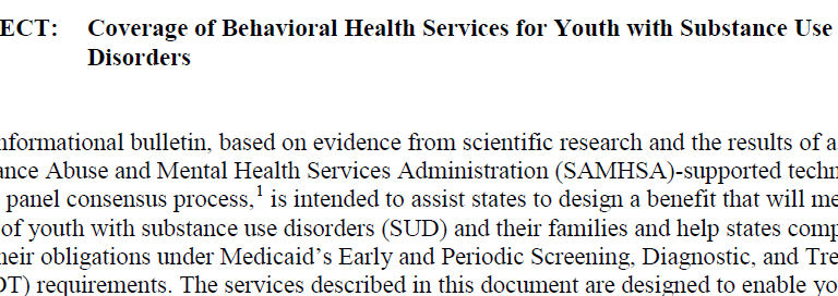 This informational bulletin helps states design a benefit to address the needs of youth with substance use disorders (SUD), consistent with the requirements of Medicaid's Early and Periodic Screening, Diagnostic and Treatment entitlement.